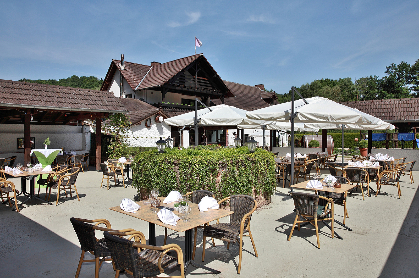 Bring your loved ones, colleagues and friends together at a restaurant where simplicity joins forces with gastronomy and quality of service. Take advantage of the gardens and the vast terrace for some pleasant moments outdoors. A play area will delight our youngest guests: slides, walkways, rope wall, and more. With its original barrel shape, a heated smoking room is also available next to the terrace.
